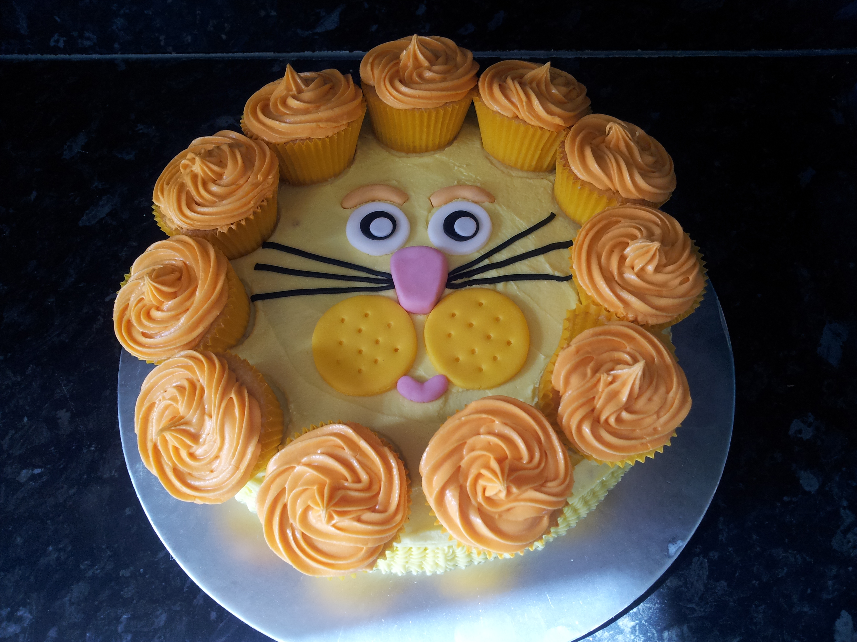 A delicious vanilla cake covered with vanilla buttercream, topped with a mane of orange frosted cupcakes and finished with an adorable cartoon lions face. Making him the tastiest king of the jungle