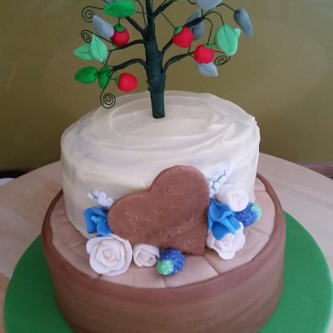 A gorgeous two tier cake celebrating 5 years of marriage. The cake tells a story…the base layer is a tree stump depicting the 5th wedding anniversary which is traditionally wood. The flowers are a recreation of the wedding bouquet and a plaque etched with the initials and wedding date. It is finished with a handmade … More 5th Anniversary Cake